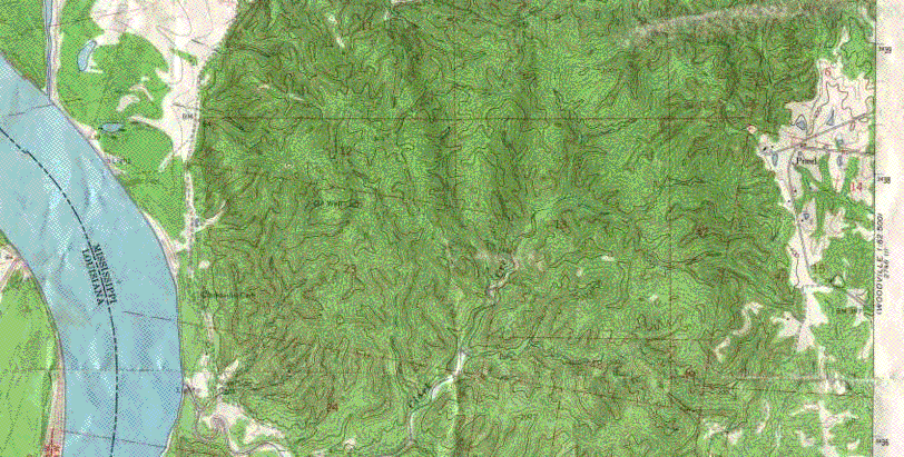This is a topographic map, which says that the diferent levels of height are shown. You can see the Mississippi River to the Western side of it. Clark Creek is a small channel that extends off to the side of the river. This is where our class went to spend our Saturday in September. The area itself is full of hills, as well as valleys and straight bits of land that range anywhere from 400 feet above sea level to 100 feet above sea level. The highest point of the area is off to the side of the small road that leads up to the parking lot where our treacherous journey began. The lowest point is located on the floor of the creek itself, a mere 100 feet above sea level. Our trek started off rough, as we went down nearly 200 feet in less than half a mile, not to mention the twists and turns throughout. It wasn't all straight down, though. We witnessed a formation known as a divide, where we passed safely over a higher strip of land while looking over both sides to see a deadly 150 to 200 foot drop on either! Whooa!! The divide was only about 10 or 15 feet wide. By the time we got to the bed of the creek itself, the change in height was obvious. The floor was usually a steady 100 feet above sea level, but there were places where cliffs rose up 100 feet on both sides, and all very straight, as well as jagged. We continued on our hike, and we eventually passed a total of 4 beautiful waterfalls, ranging from 16 to 25 feet high. When we got to the last waterfall, we stopped and did our work, taking pictures, collecting samples, and fighting off poisonous snakes. On the return trip we made a few more observations about several cliffs, some jagged, some steady, and pointed out where certain rocks had been cut away and the land left open to erosion. The walk back up the big hill was a nightmare, because we had to go from 150 feet to about 300 feet in less than a mile, and all over smooth, gripless soil. When we got back, we ate cookies and sandwiches and came back home. Whew! What a trip!